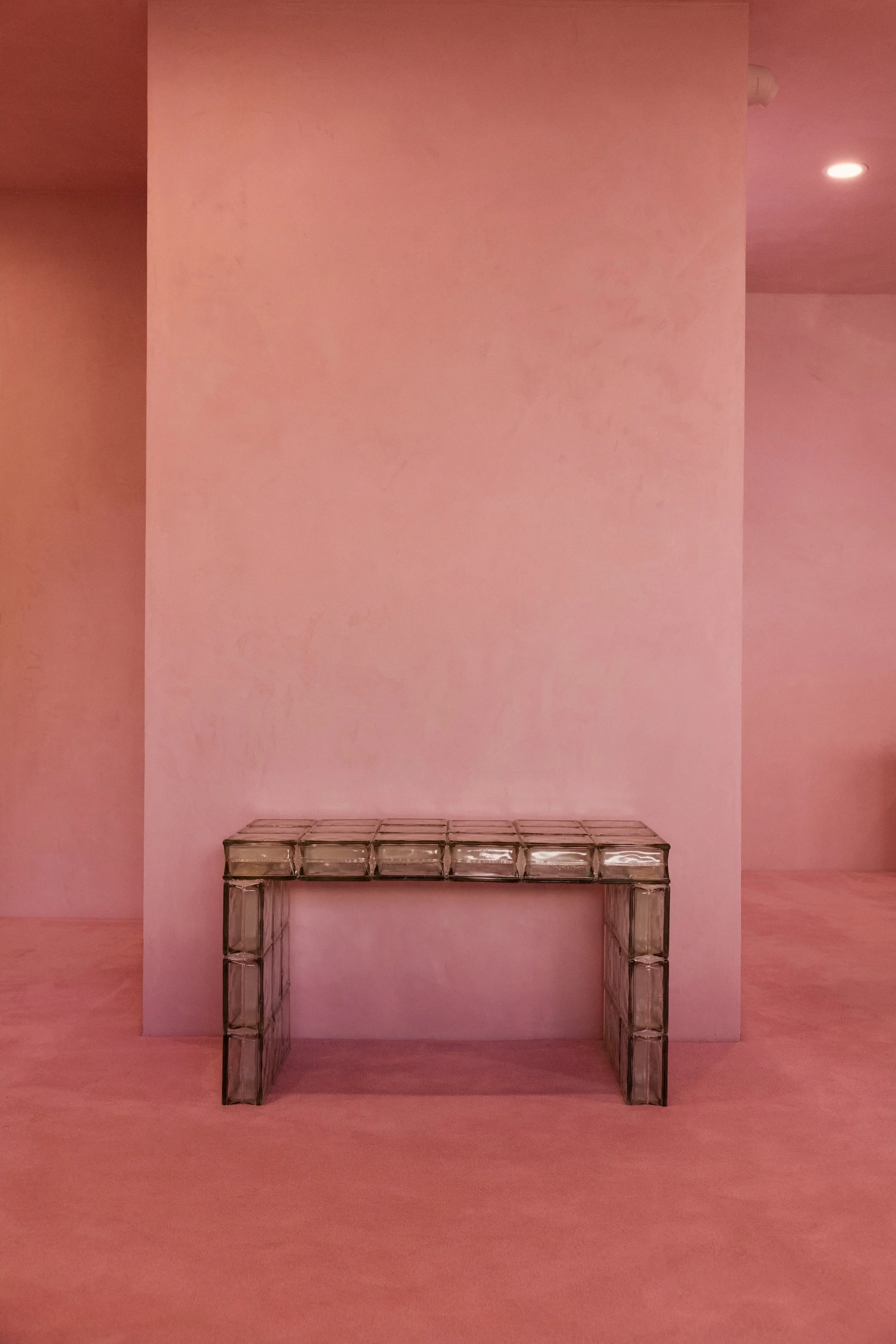 This bench was designed from the remaining blocks of our glass-block wall, creating a seamless extension of the material palette