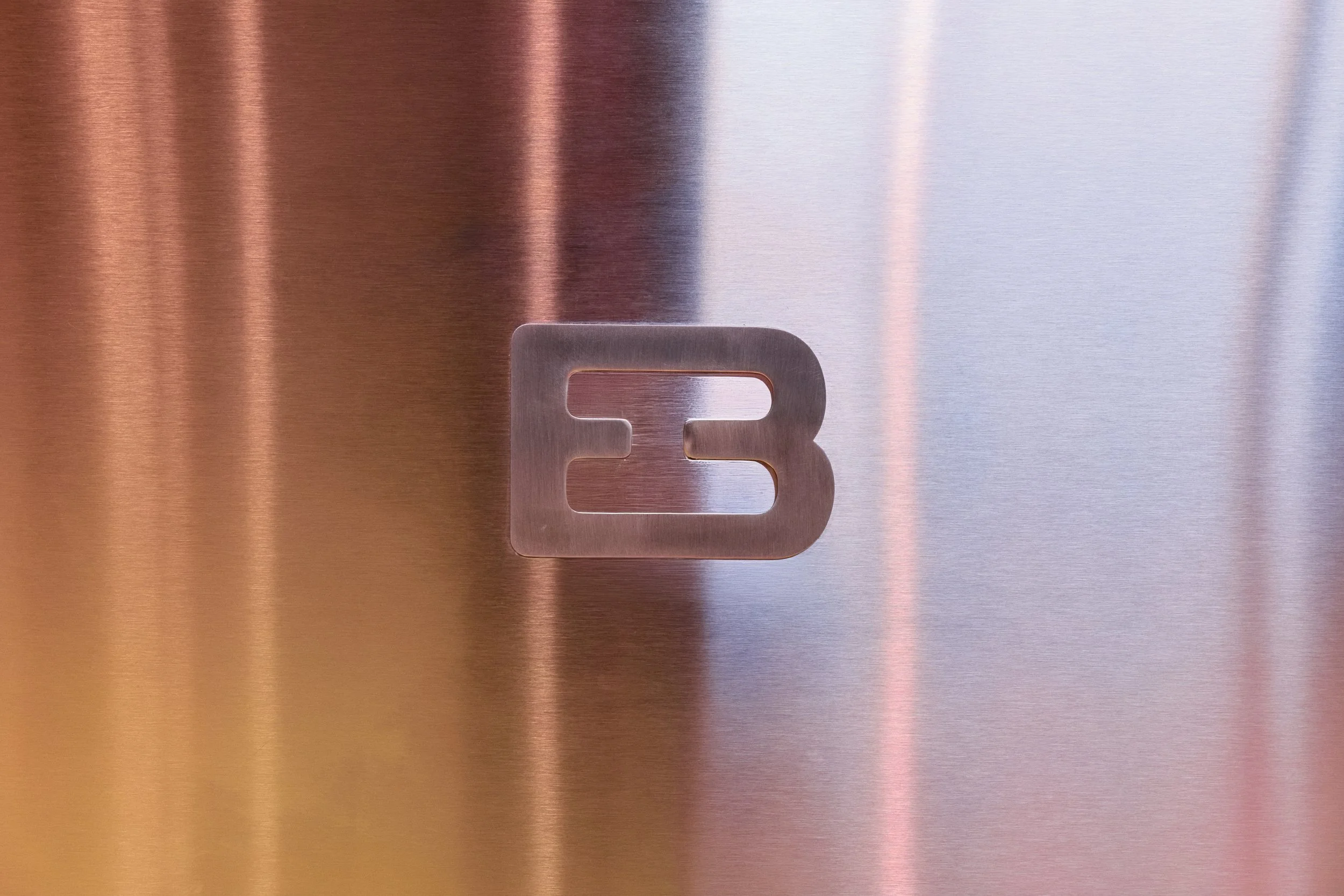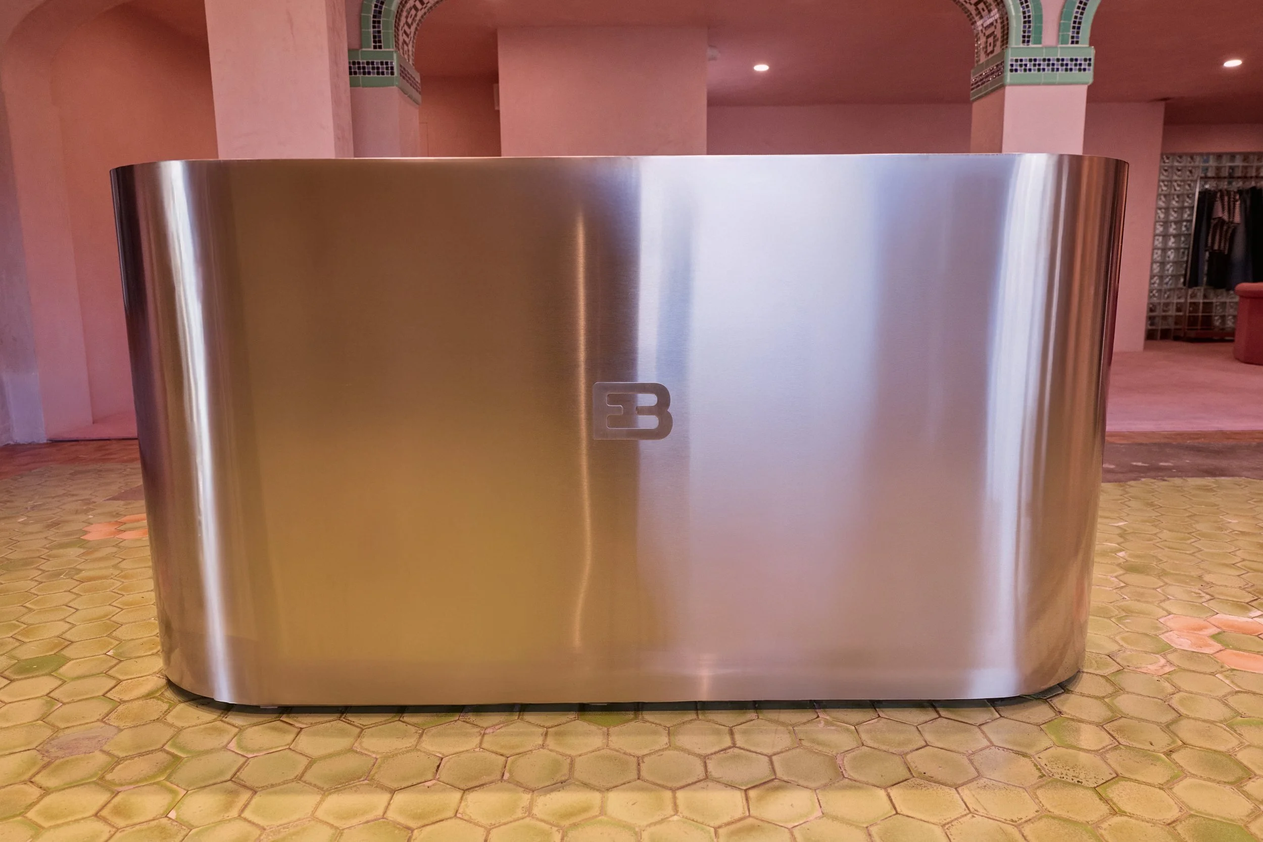 Crafted from brushed stainless steel, this cabinet combines clean function with a refined silhouette. Rounded corners soften the material, giving it a smooth, modern presence in the space. The front features a laser cut logo. Inside offers concealed shelving and flush mount doors.