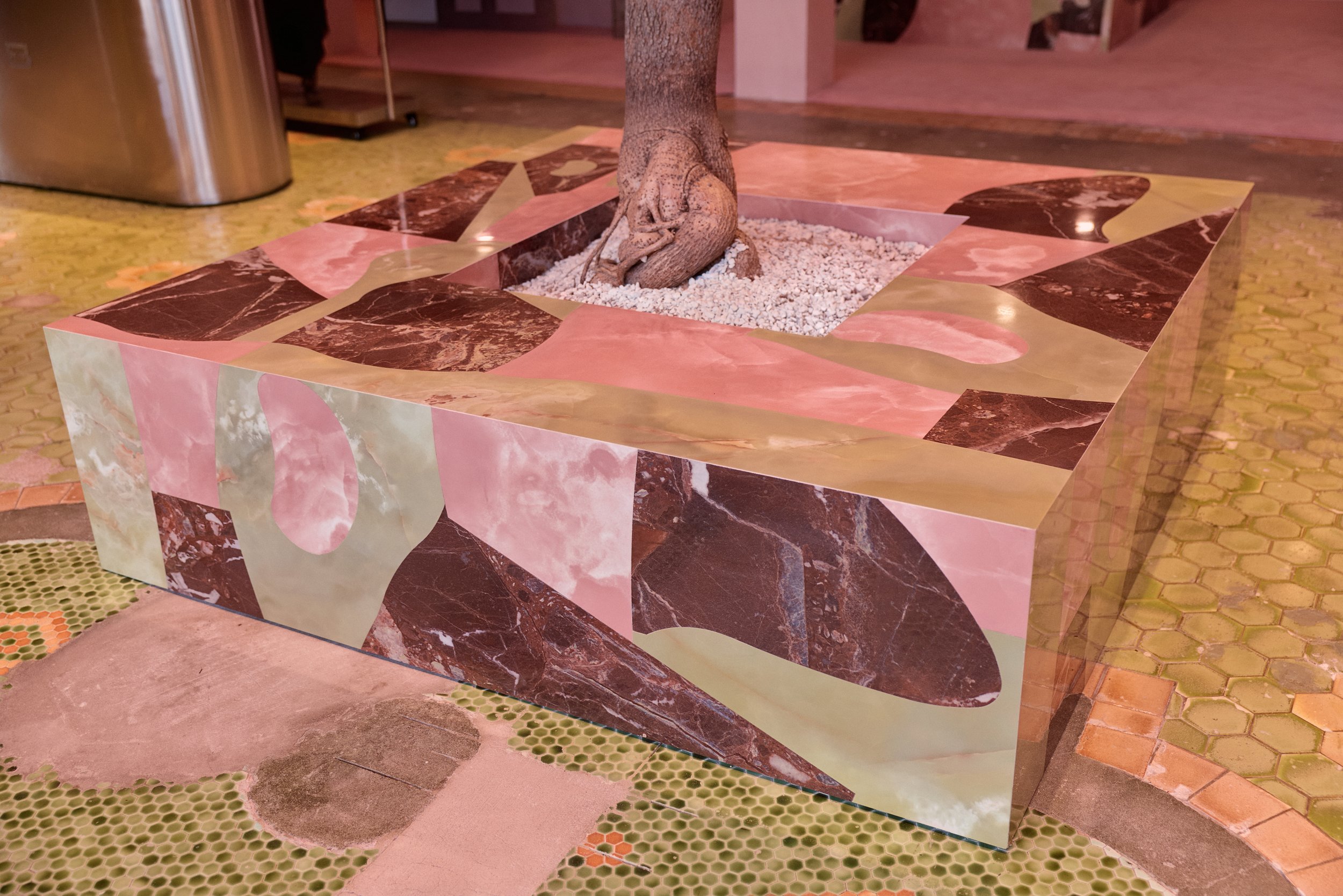 This design is rooted in form and function — the pot doubles as seating, creating both a sculptural anchor and a practical element within the space. It features a custom pattern, with each piece individually placed. Crafted from durable sintered stone.