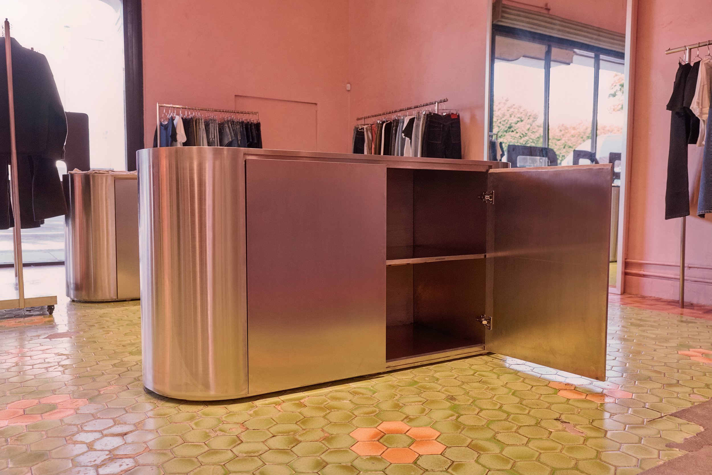 We designed these racks as a way to be able to move around the store, To re-merchansise if need need be. Made from stainless steel with the EB Denim logo as a subtle touch.